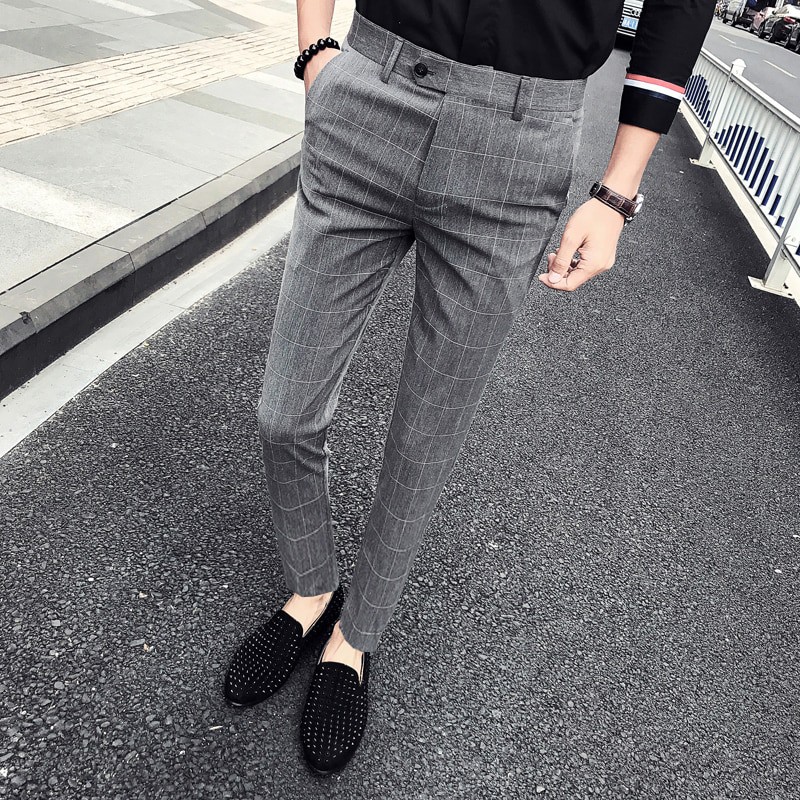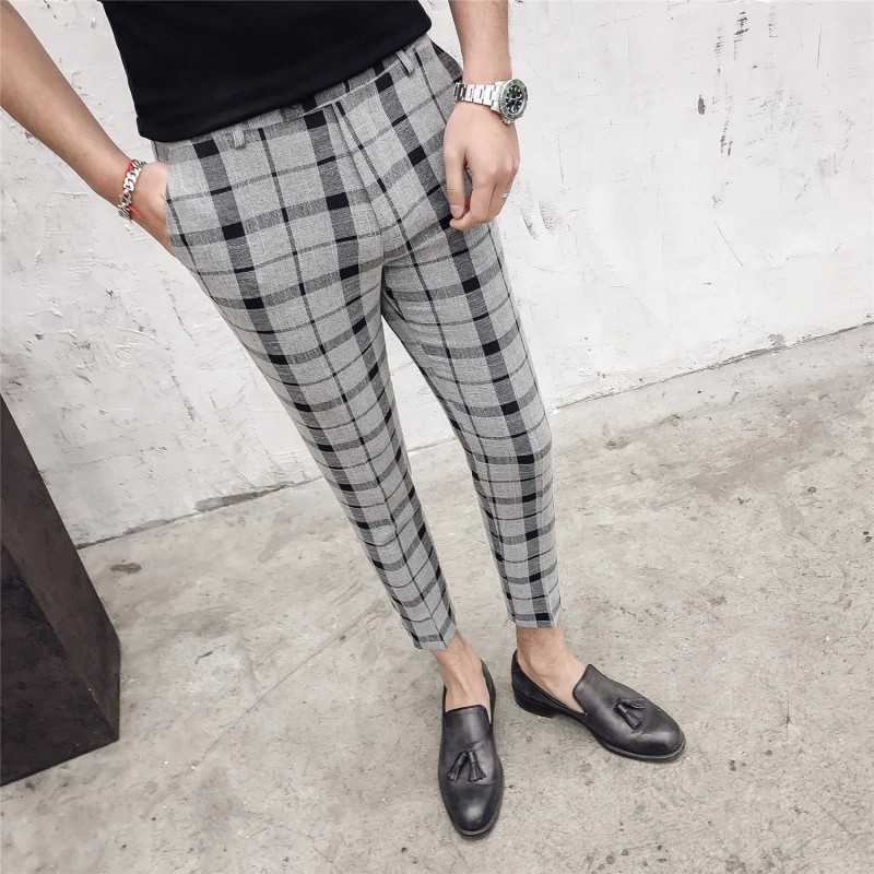 2019 Men Dress Pant Plaid Business Casual Slim Fit Ankle Length