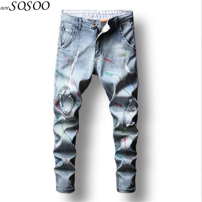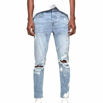 2019 Fashion Light Blue Ripped Jeans Slim Fit Mens With Paint