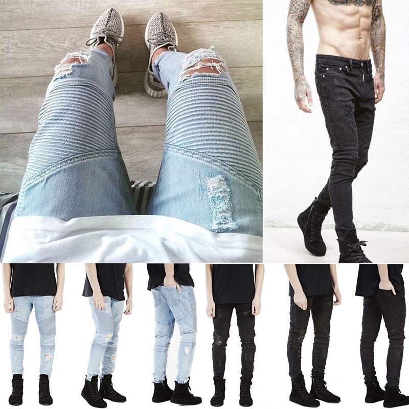 Kanye West Skinny Ripped Jeans For Men Male Black Motorcycle