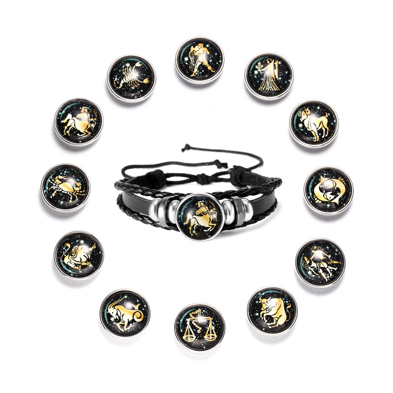 12 Zodiac Signs Braid Leather Fashion Vintage Button Bracelet Men