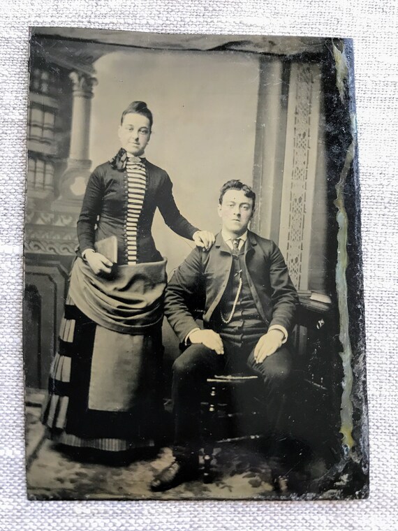 Victorian Era Tintype Photograph Man And Woman In Stripes Etsy