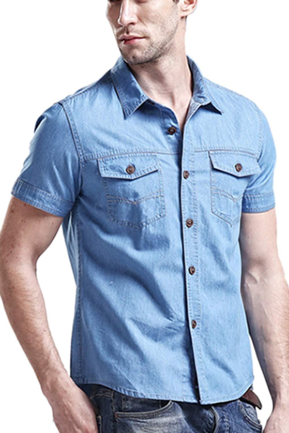 Vepodrau Men Shirts Casual Short Sleeve Denim Jean Button Down