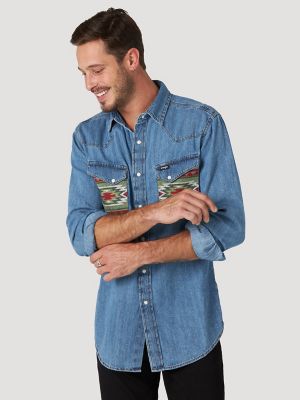 Men S Wrangler Printed Pocket Western Denim Shirt Mens Shirts