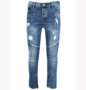 Latest Men Ripped Denim Jeans Mid Blue Slim Biker Jeans With Zip