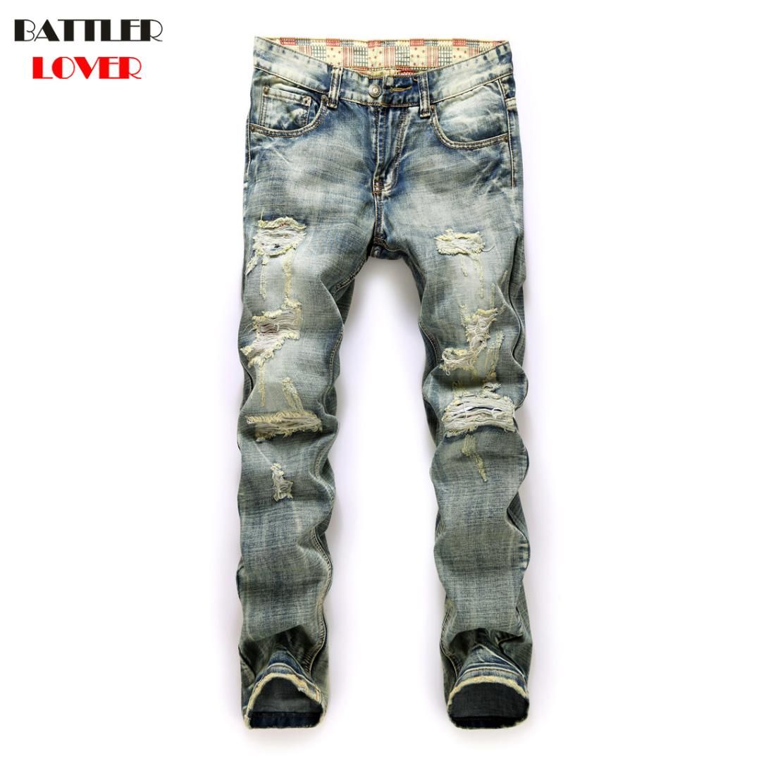 European Famous Brand Light Blue Jeans Men Casual Fold Holes Denim
