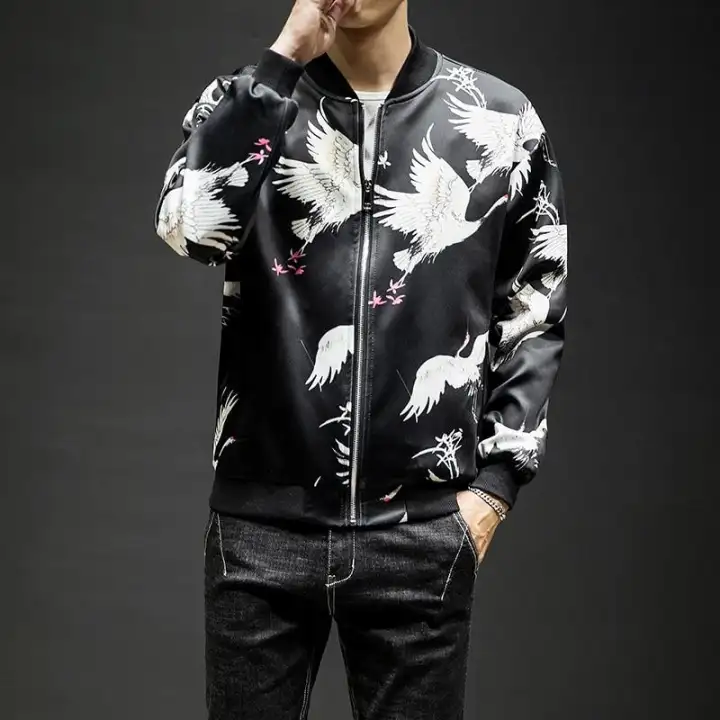 Clear Mens Fashion Japanese Embroidered Bird Baseball Jacket