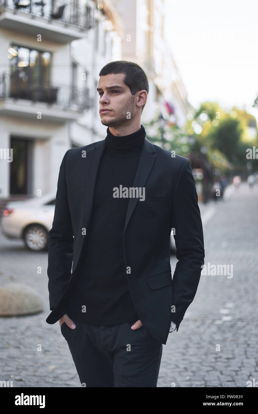 Young Man Walking Smart Casual On An Autumn Day On A Street Of