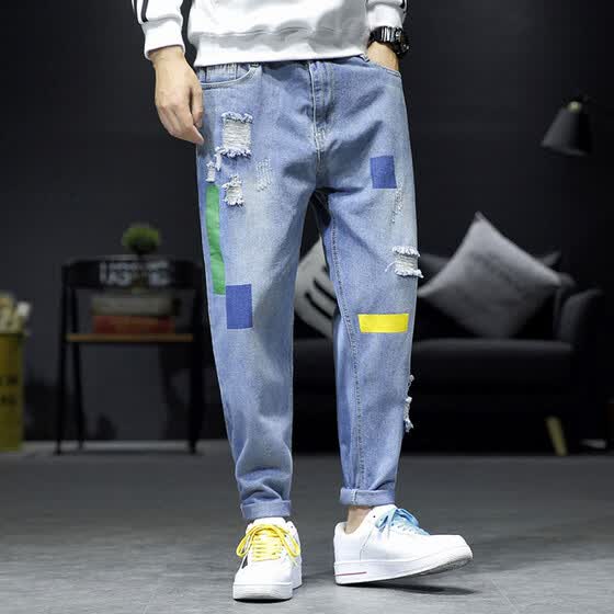 Cotton Ripped Jeans Men S Fashion Hit Color Casual Loose Hole