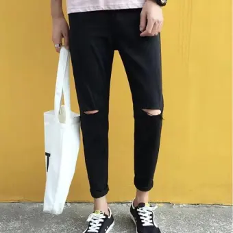 Jual Black Jeans Men Hole Casual Ripped Jeans Slim Fit Rap Hip Hop