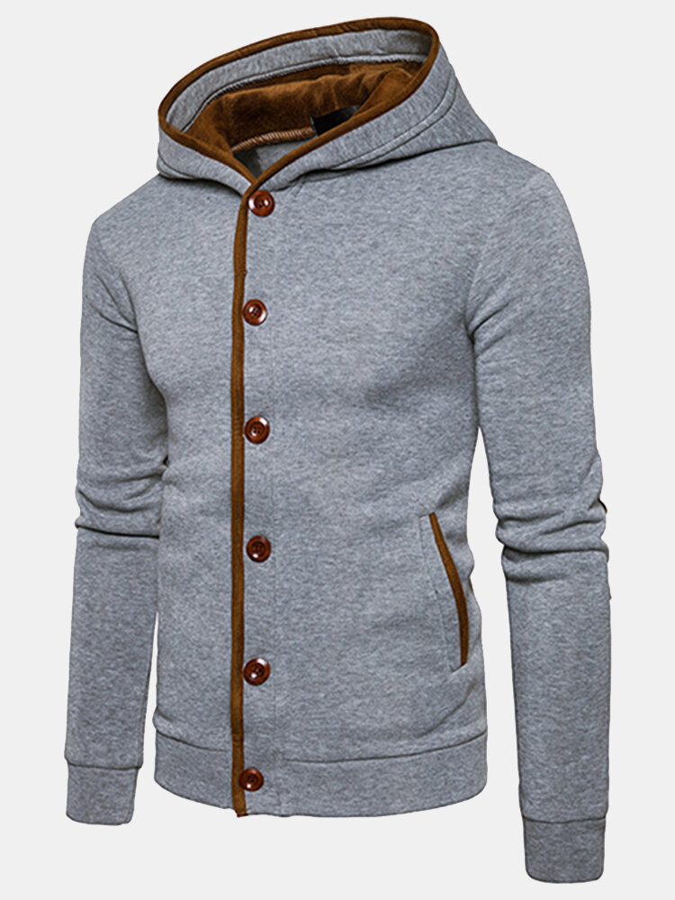 Men Fleece Elbow Patch Hooded Single Breasted Hoodies Coat Male